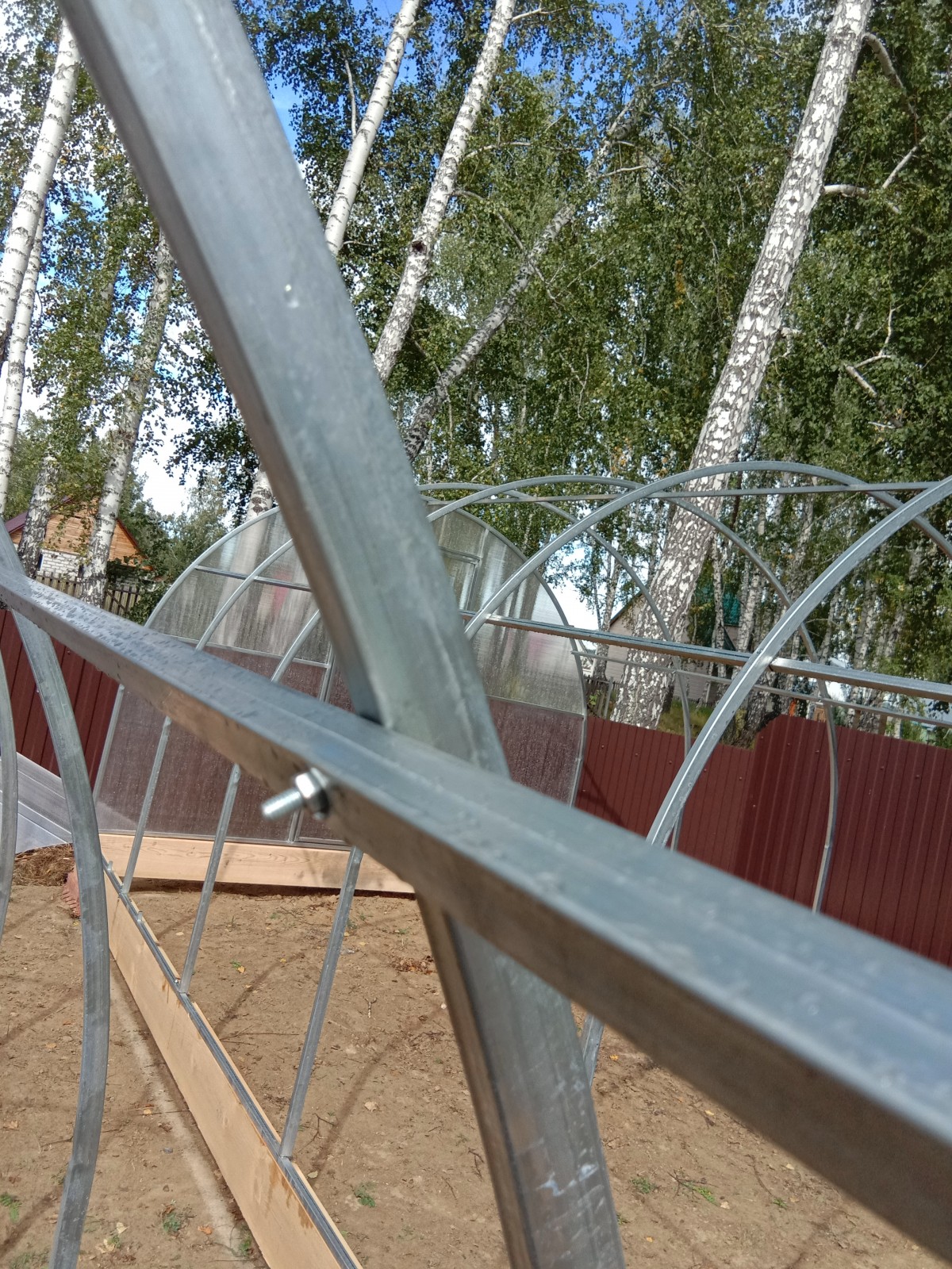 Горизонтальные стрингера в нашей теплице имеют длинну 4 метра и не имеют соединений, что значительно усиливает конструкцию в целом.
